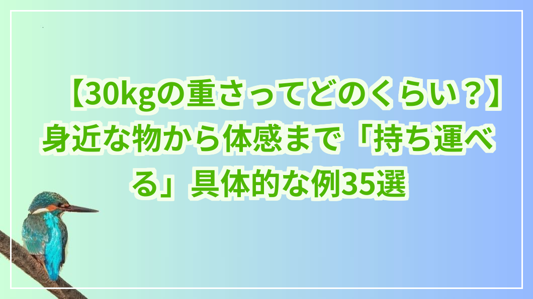 「30 キロ」という重さを聞いて、あなたはどう感じますか? 「結構重いな」と思う人もいれば、「まあ、頑張れば運べるかな?」と漠然としたイメージを持つ人もいるでしょう。しかし、この「30キロ」という重さ ...