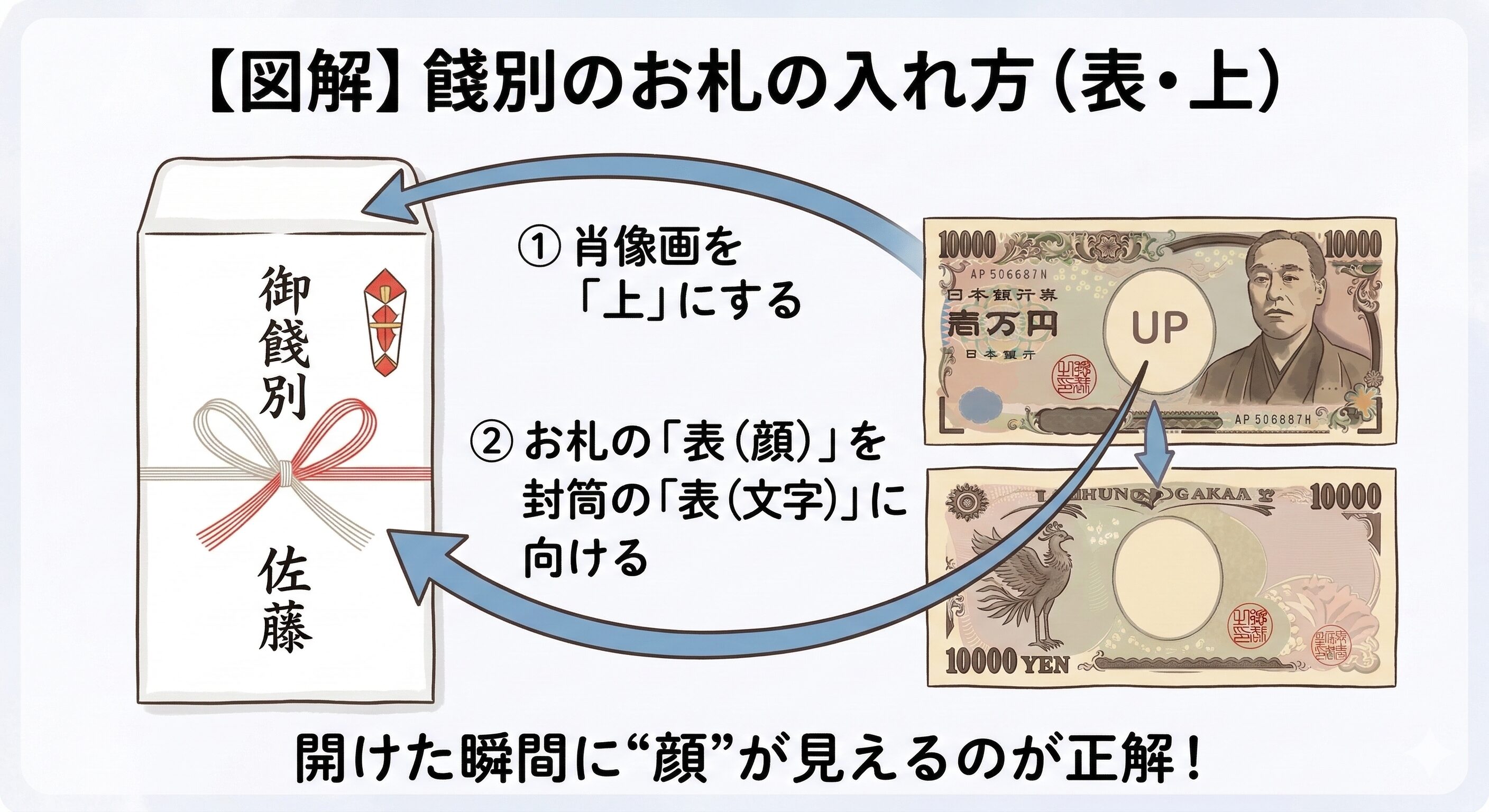 - 向きの正解: 封筒の表に対して、お札の「表(顔)」を向け、「上」に来るように入れる。